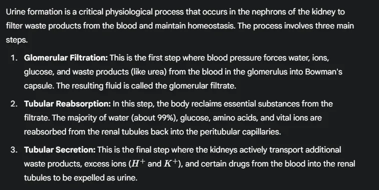 Urine formation is a critical physiological process that occurs in the nephrons of the kidney to filter waste products from the blood and maintain homeostasis. The process involves three main steps.