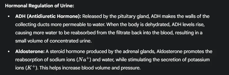 ADH (Antidiuretic Hormone): Released by the pituitary gland, ADH makes the walls of the collecting ducts more permeable to water. When the body is dehydrated, ADH levels rise, causing more water to be reabsorbed from the filtrate back into the blood, resulting in a small volume of concentrated urine.