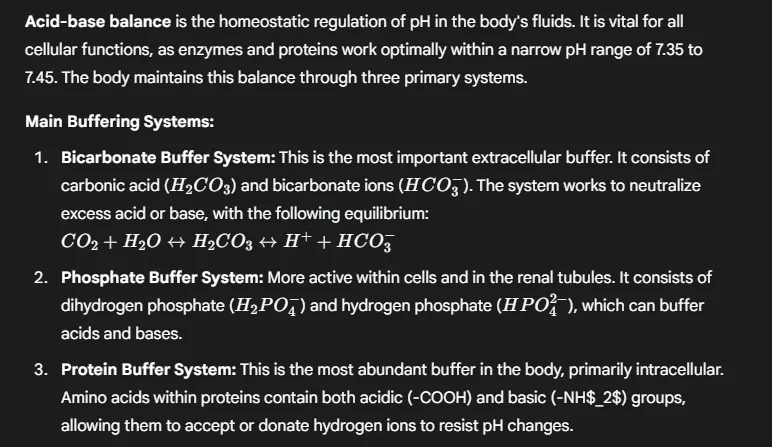 Acid-base balance is the homeostatic regulation of pH in the body’s fluids. It is vital for all cellular functions, as enzymes and proteins work optimally within a narrow pH range of 7.35 to 7.45. The body maintains this balance through three primary systems.