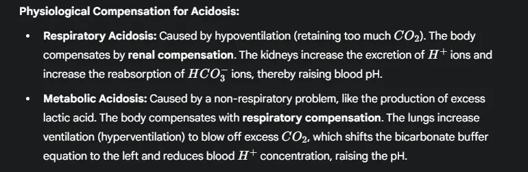 - Metabolic Acidosis: Caused by a non-respiratory problem, like the production of excess lactic acid. The body compensates with respiratory compensation. The lungs increase ventilation (hyperventilation) to blow off excess CO_2, which shifts the bicarbonate buffer equation to the left and reduces blood H^+ concentration, raising the pH.