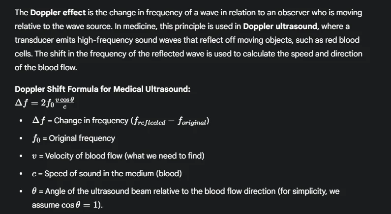 The Doppler effect is the change in frequency of a wave in relation to an observer who is moving relative to the wave source. In medicine, this principle is used in Doppler ultrasound, where a transducer emits high-frequency sound waves that reflect off moving objects, such as red blood cells. The shift in the frequency of the reflected wave is used to calculate the speed and direction of the blood flow.