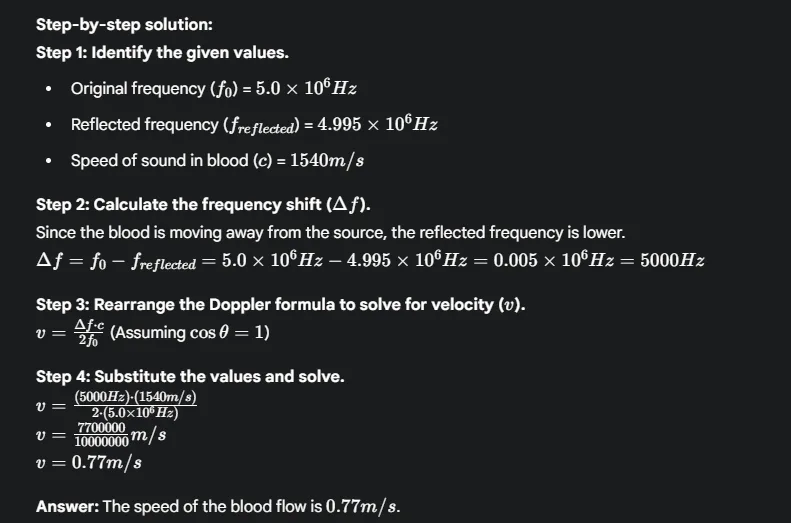 Step 2: Calculate the frequency shift (\Delta f). Since the blood is moving away from the source, the reflected frequency is lower. \Delta f = f_0 – f_{reflected} = 5.0 \times 10^6 Hz – 4.995 \times 10^6 Hz = 0.005 \times 10^6 Hz = 5000 Hz