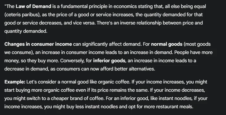 “The Law of Demand is a fundamental principle in economics stating that, all else being equal (ceteris paribus), as the price of a good or service increases, the quantity demanded for that good or service decreases, and vice versa. There’s an inverse relationship between price and quantity demanded.