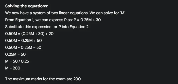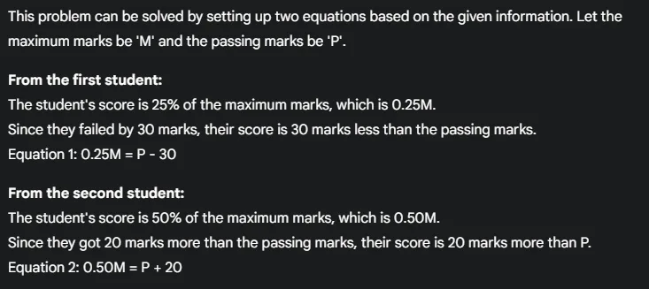 This problem can be solved by setting up two equations based on the given information. Let the maximum marks be ‘M’ and the passing marks be ‘P’.