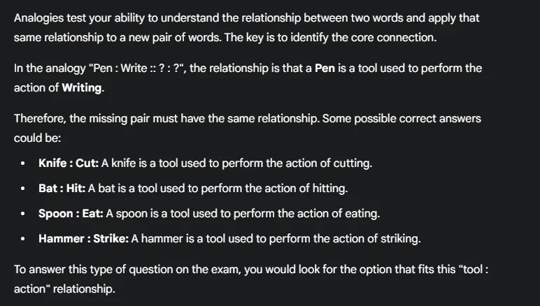Analogies test your ability to understand the relationship between two words and apply that same relationship to a new pair of words. The key is to identify the core connection.
