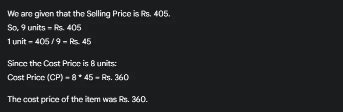 We are given that the Selling Price is Rs. 405. So, 9 units = Rs. 405 1 unit = 405 / 9 = Rs. 45